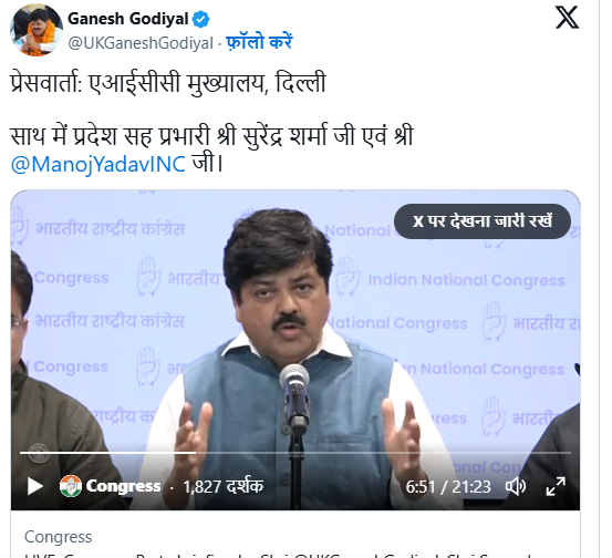 गणेश गोदियाल ने उत्तराखंड के बीजेपी संगठन और सरकार पर आरोप लगाते हुए कहा कि उन्होंने सत्ता की पूरी ताकत अंकिता भंडारी हत्याकांड को दबाने और वीआईपी की बचाने में लगाई. आज उनकी पार्टी के नेता के वीडियो में ही VIP का नाम सामने आया, फिर सरकार चुप है. गोदियाल ने चेतावनी दी है कि यदि सरकार ने अब भी इस मामले को गंभीरता से नहीं लिया और सीबीआई जांच नहीं कराई तो कांग्रेस गढ़वाल मंडल मुख्यालय पर विशाल धरना प्रदर्शन करेगी.