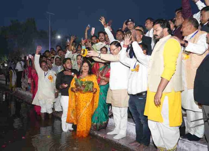 मुख्यमंत्री धामी ने खटीमा में सूर्य षष्ठी महोत्सव में की सहभागिता, अस्ताचलगामी सूर्य को दिया अर्घ्य