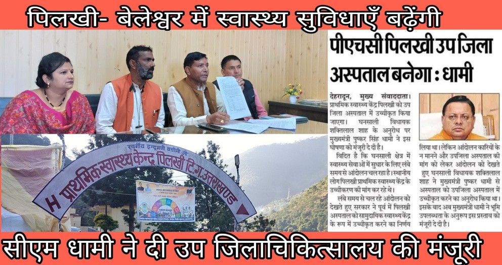 मुख्यमंत्री पुष्कर सिंह धामी द्वारा विधायक घनसाली शक्ति लाल शाह के अनुरोध पर विधानसभा क्षेत्र घनसाली के प्राथमिक स्वास्थ्य केन्द्र पिलखी विकासखण्ड भिलंगना को भूमि उपलब्धता के अनुरूप उप जिला चिकित्सालय के रूप में उच्चीकृत किये जाने के प्रस्ताव को मुख्यमंत्री घोषणा में शामिल किये जाने का अनुमोदन प्रदान किया गया है।
