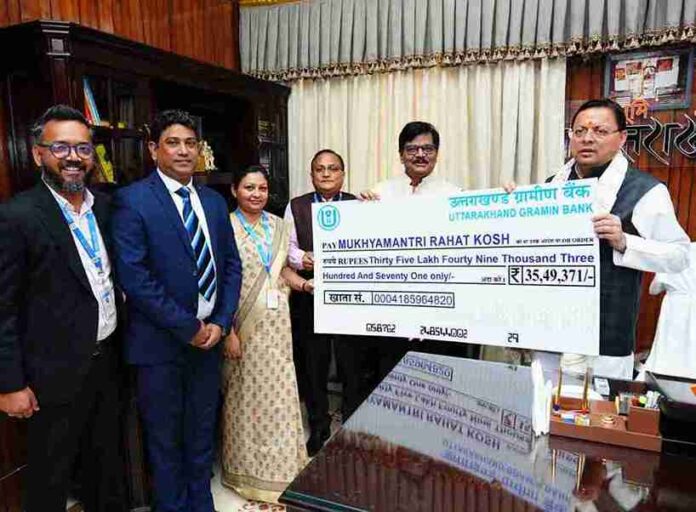 मुख्यमंत्री पुष्कर सिंह धामी से शनिवार को मुख्यमंत्री कैंप कार्यालय में उत्तरांचल ग्रामीण बैंक के प्रतिनिधियों ने भेंट की। इस दौरान बैंक प्रतिनिधियों ने उत्तराखंड में आपदा प्रभावितों की सहायता एवं पुनर्निर्माण कार्यों के लिए ₹ 35,49,371 की धनराशि मुख्यमंत्री राहत कोष में प्रदान की।